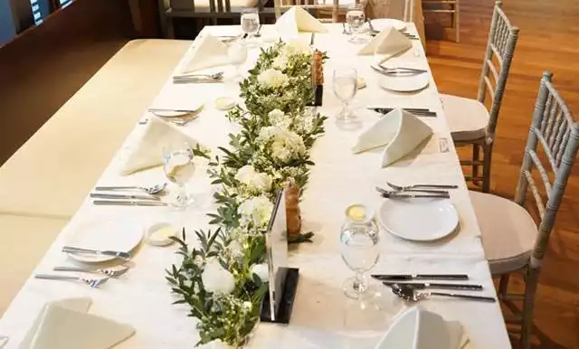 - Reception Table: A simple, elegant layout with green and white floral centerpieces, accented by small candles for a warm, welcoming glow.