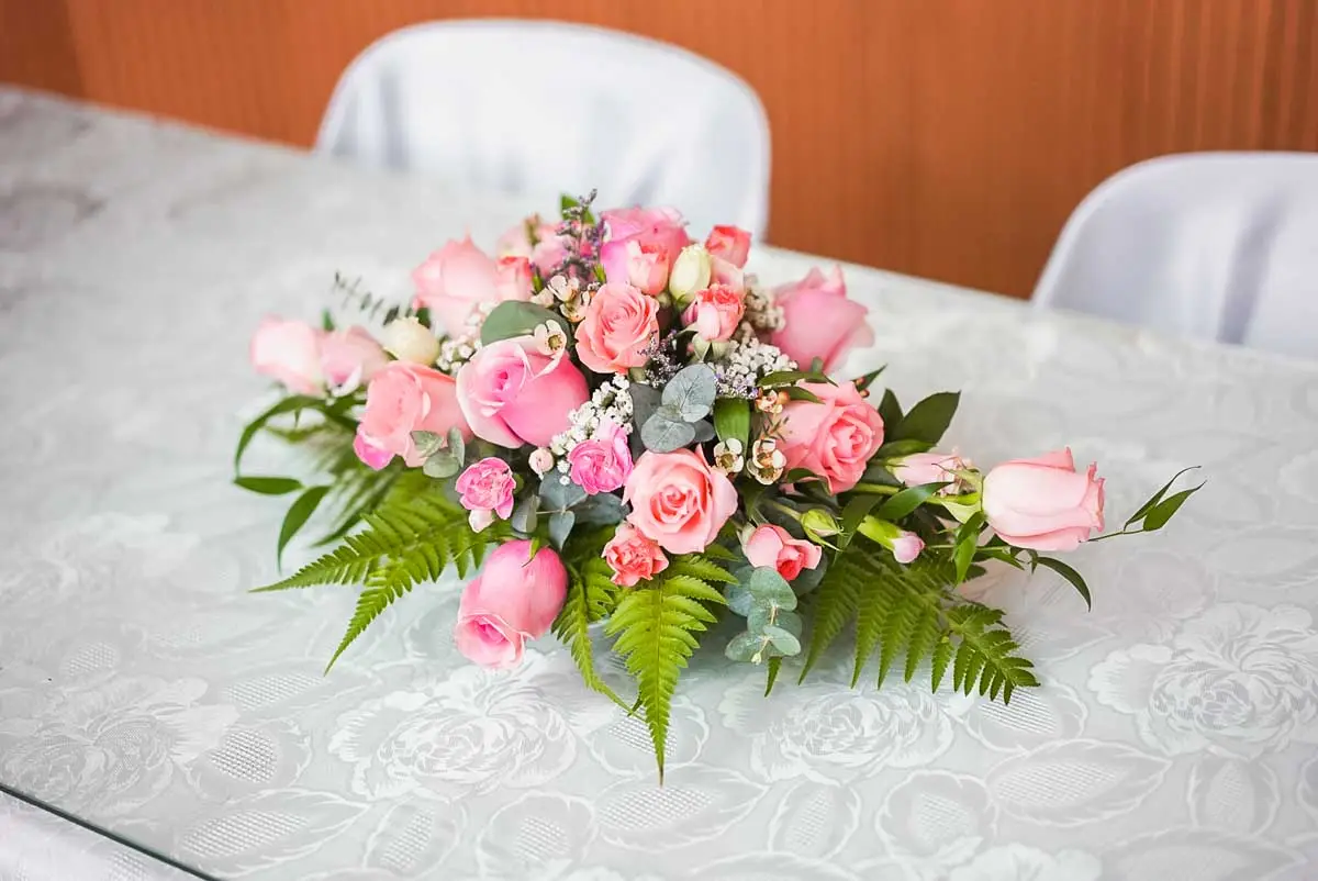 The long and low table centerpiece for the signing table follows the wedding theme colors with different tones of pink.