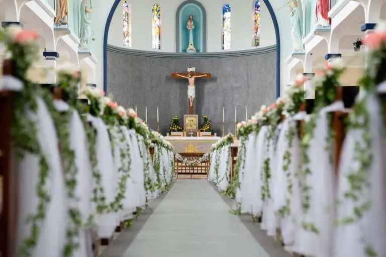 The Church of Our Lady Queen of Peace is a favourite wedding venue for our decoration projects. A key part of our service is advising couples on how to choose the perfect wedding decor to match their venue and desired atmosphere. The most important step? Choosing your wedding decoration theme.