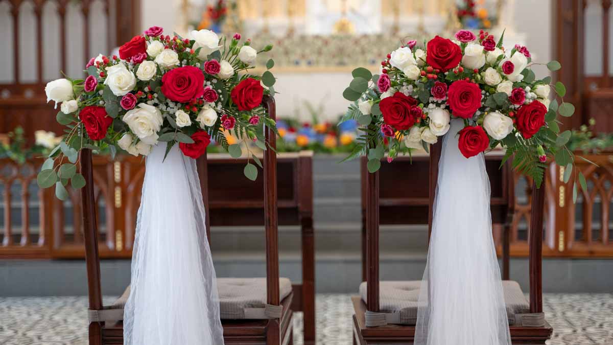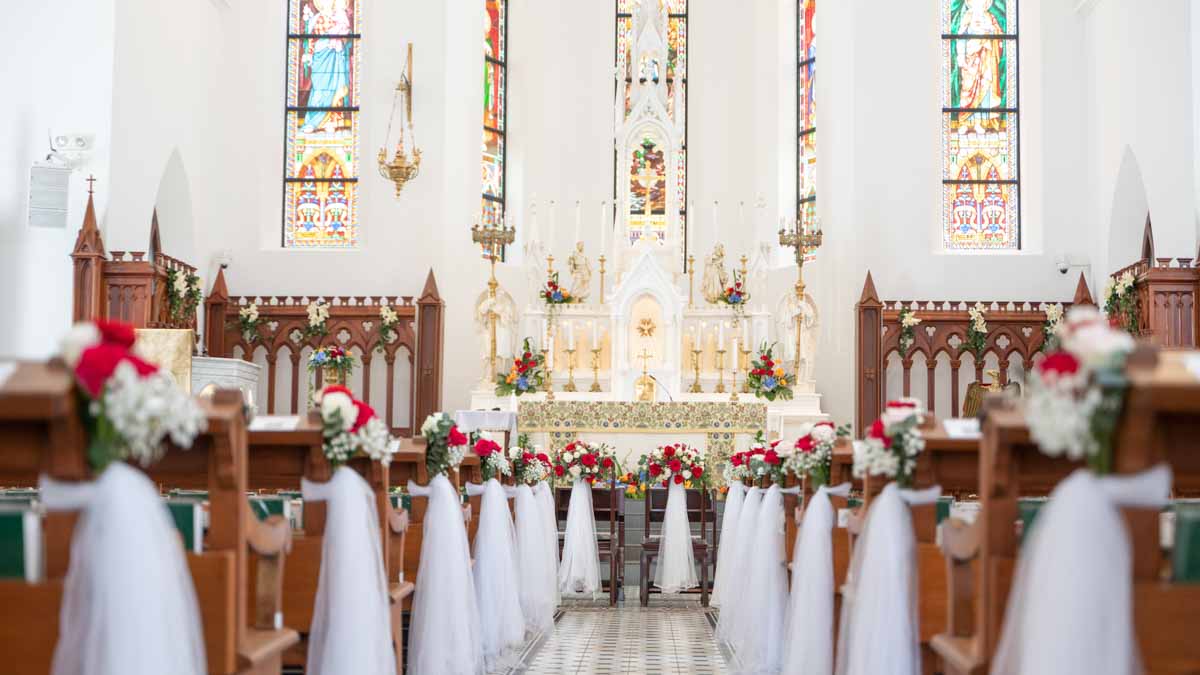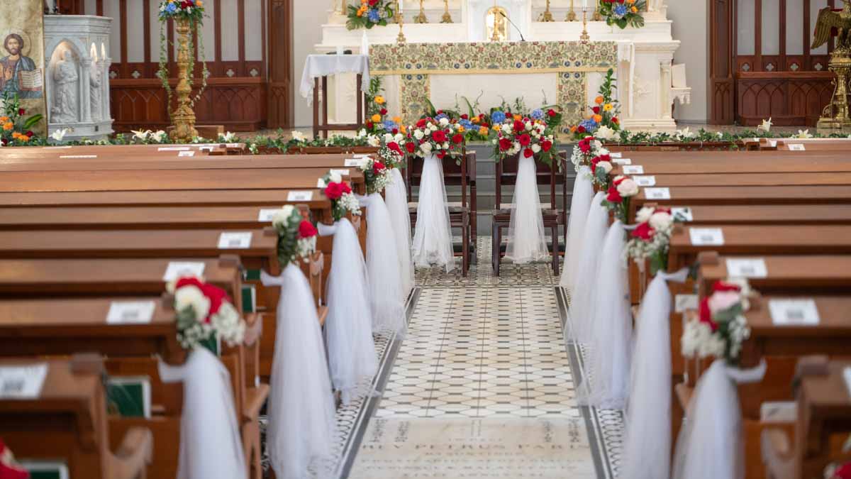 Radiant Elegance: Vibrant Wedding Decor at Church of St. Peter and Paul in Bright Red, Pastel Pink, and White