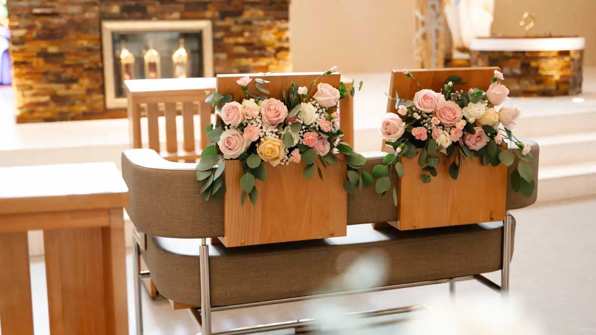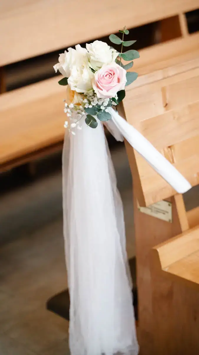 The beauty of this theme extends to every aspect of the wedding. Pews and chairs are adorned with posies and white sashes, creating an atmosphere of grace and comfort for all in attendance.