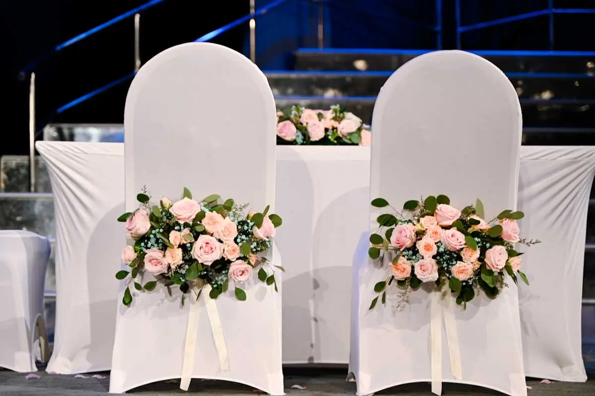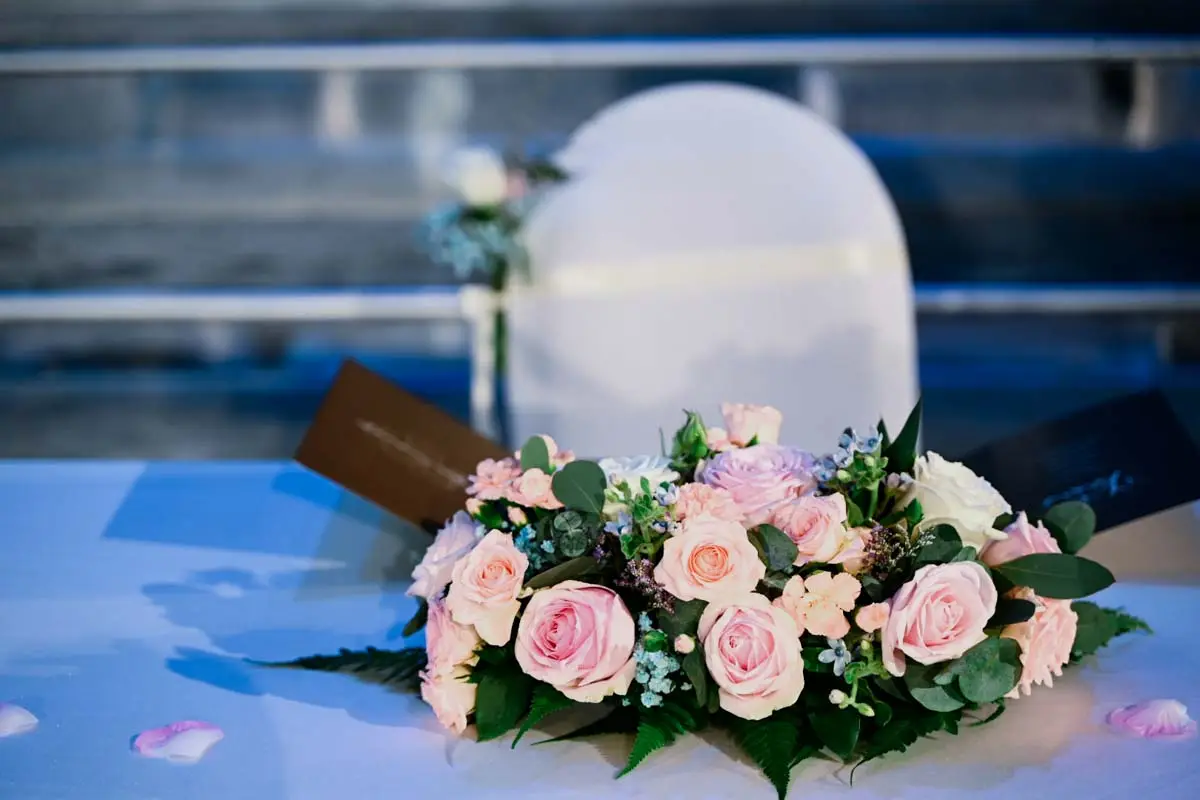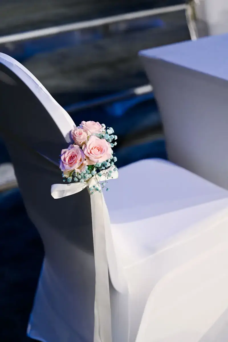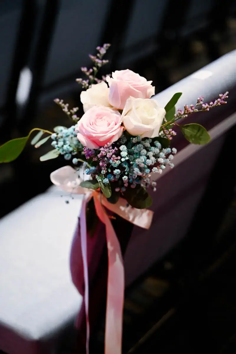 Aisle chairs are adorned with posies and long ribbons, creating an atmosphere of grace and comfort for all in attendance. A centrepiece adorns the signing table, adding a touch of grace to the vows exchanged. The couple’s chairs, decorated with fresh flower garlands, ensure that every corner of the church resonates with the chosen color scheme.